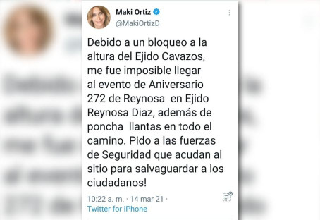 “Debido a un bloqueo a la altura del Ejido Cavazos, me fue imposible llegar al evento de Aniversario 272 de Reynosa, en el Ejido Reynosa Díaz, además de poncha llantas en todo el camino. Pido a las fuerzas de Seguridad que acudan al sitio para salvaguardar a los ciudadanos!”.