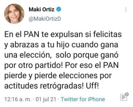 “En el PAN te expulsan si felicitas y abrazas a tu hijo cuando gana una elección, solo porque ganó por otro Partido!. Por eso el PAN pierde y pierde elecciones por actitudes retrógradas!. Ufff!”.