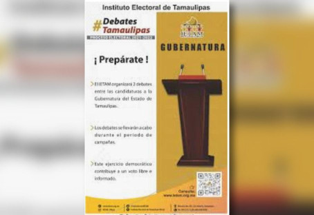 Por otro lado, comentaremos, que ya están en puerta los debates entre los candidatos a la gubernatura de Tamaulipas: AMÉRICO VILLARREAL ANAYA de Morena, PT, PVEM; CÉSAR VERÁSTEGUI OSTOS del PRI, PAN, PRD y ARTURO DIEZ GUTIÉRREZ de Movimiento Ciudadano, organizados por el IETAM, mismos que conducirán los periodistas capitalinos ANA MARÍA LOMELÍ y JAVIER SOLÓRZANO, los días 24 de abril y 22 de mayo.