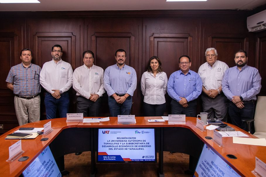 En la reunión efectuada en la sala de juntas de la Administración Central en Ciudad Victoria, el Rector Guillermo Mendoza Cavazos estuvo acompañado del Ing. Jesús Rafael Villarreal Cantú, Subsecretario para la Pequeña y Mediana Empresa del Gobierno de Tamaulipas; el Dr. Eduardo Arvizu Sánchez, Secretario General de la UAT; y la Dra. Mariana Zerón Félix, Secretaria de Investigación y Posgrado de esta casa de estudios.