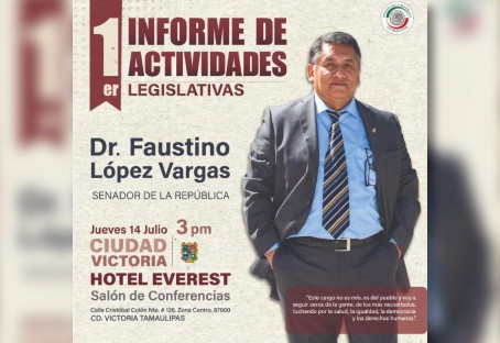 Llama la atención que, a 6 meses de haber asumido la Senaduría, Faustino López Vargas se apresta a rendir un Informe de actividades, mismo que tendrá lugar el jueves 14 de julio a las 15:00 horas en el hotel Everest de Ciudad Victoria.