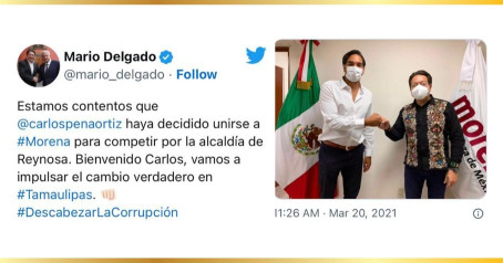 Un ejemplo de ello, es lo acontecido en 2021, con CARLOS VÍCTOR PEÑA ORTIZ, actualmente alcalde de Reynosa, quien fue designado como candidato de Morena, vía “fast-track”.