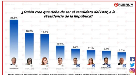 En la más reciente encuesta de una empresa denominada “Rubrum”, aparece SANTIAGO CREEL MIRANDA en primera posición, con 26.8 por ciento de aceptación, ante la pregunta: “¿Quién cree que debe ser el candidato del PAN a la presidencia de la República?”.