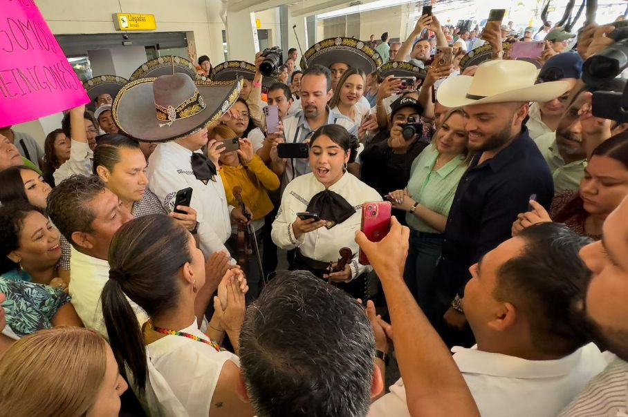 Puerto Vallarta, Jalisco.- A su llegada al Aeropuerto Internacional de Puerto Vallarta, Claudia Sheinbaum fue recibida por la alegría de los simpatizantes y militantes de la entidad con la música del tradicional mariachi de Jalisco.