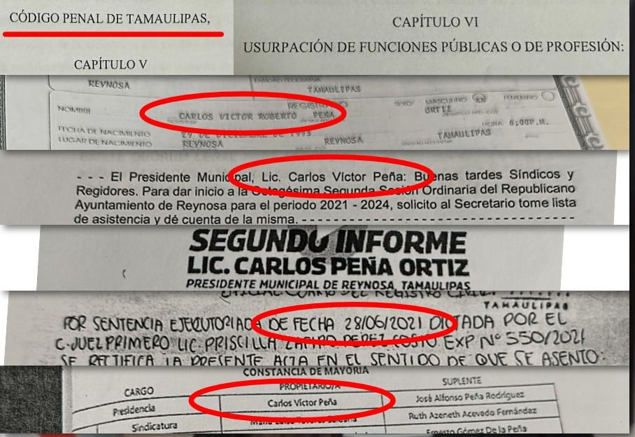 El alcalde de Reynosa, Carlos Victor Peña Ortiz podría haber incurrido en el Delito de Usurpación de Profesión y de Variación de Nombre en caso de ser encontrado culpable de las denuncias penales interpuestas por los abogados Jesús Ulises Montelongo Aguilar y Lamberto Rocha Obregón quienes solicitaron a la autoridad competente iniciar un proceso de investigación al respecto.