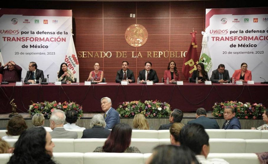 CDMX.- La Coordinadora de Defensa de la Transformación, Claudia Sheinbaum Pardo, sostuvo este miércoles un encuentro con los grupos parlamentarios de Morena, Partido del Trabajo (PT), Partido Verde Ecologista de México (PVEM) y el Partido Encuentro Social (PES), en el Senado de la República, en donde recalcó la importancia de seguir sumando esfuerzos en unidad para fortalecer la defensa de la Cuarta Transformación.