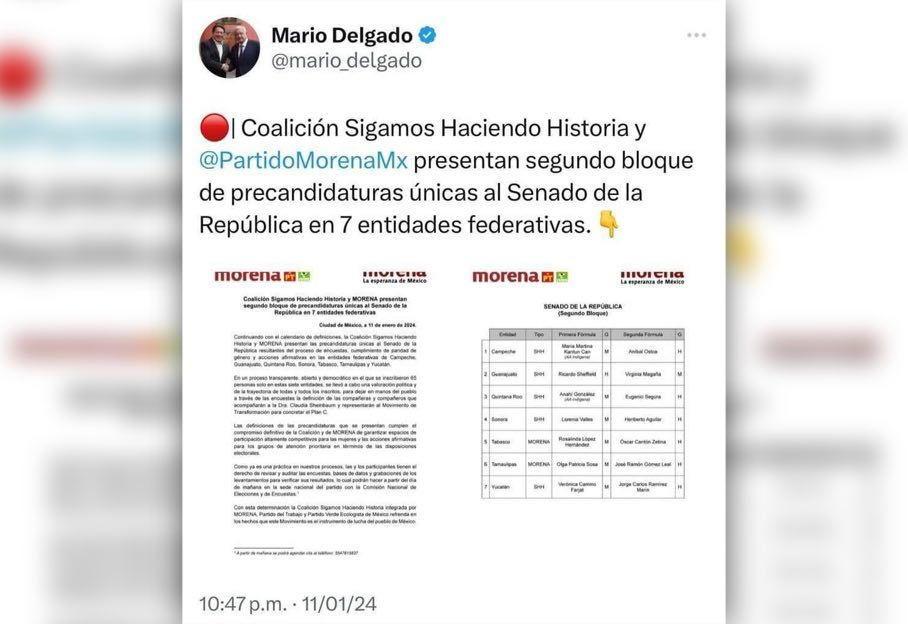 Poco antes de las 11 de la noche de éste jueves 11 de enero, el Presidente Nacional de MORENA, Mario Delgado difundió vía X el anuncio en el que incluyó a otras entidades como Tabasco, Campeche y Yucatán entre otros. En su texto, el Partido asegura que se trata de pre-candidaturas únicas que son el resultado del proceso interno de Encuestas y, todas, cumpliendo con el régimen de paridad de género y acciones afirmativas. Sosa llega a esta instancia tras desempeñarse como Secretaria del Trabajo del Estado en tanto Gómez Leal ocupaba una senaduría tras la Elección Extraordinaria del 19 de febrero anterior.
