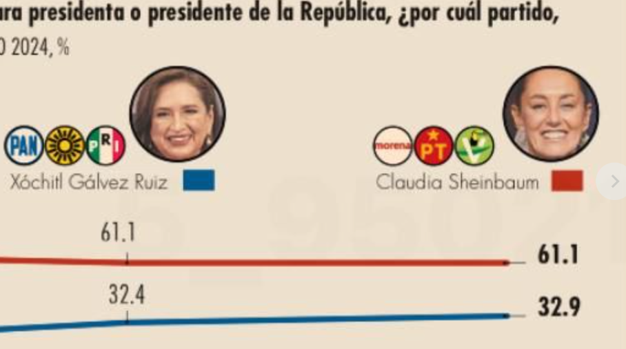 Con un porcentaje sostenido en 61.1%, la candidata presidencial de MORENA y sus Aliados Claudia Sheinbaum mantiene una notable ventaja sobre su competidora Xóchitl Gálvez del PAN-PRI-PRD quien suma 32.9% de la preferencia electoral de acuerdo con un trabajo realizado por Consulta Mitofsky que hoy da a conocer El Financiero.