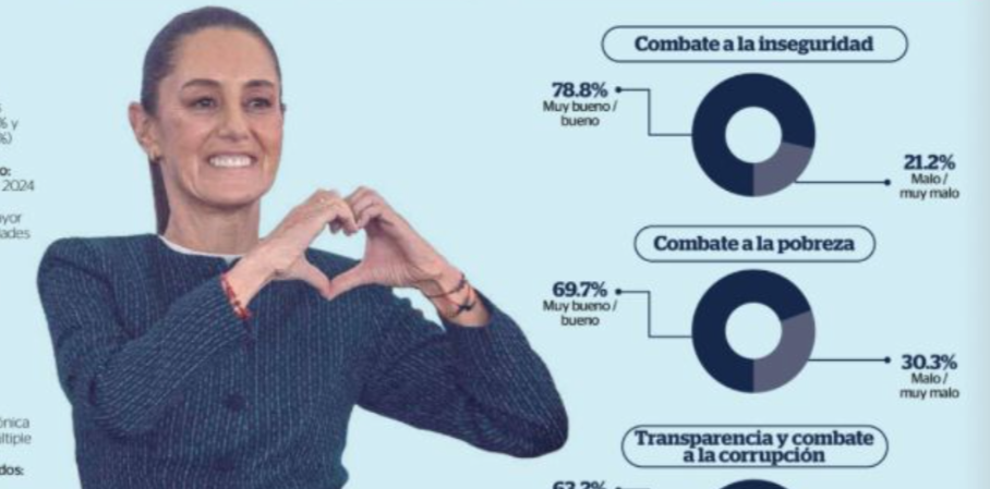 En una serie de estudios de medición, presentados éste lunes por Medios de Comunicación Nacionales como El Financiero, Reporte Indigo y El Economista, Claudia Sheinbaum destaca como presidenta de México con altos índices de aceptación; el combate a la inseguridad, pobreza y corrupción son los temas prioritarios para los mexicanos.