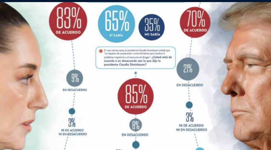 Un Estudio de Medición de QM y HMG difundida éste martes por El Heraldo revela que un 80% de los mexicanos respalda decididamente a la Presidenta Claudia Sheinbaum en su decisión de enviar una carta al Presidente Electo de EU, Donald Trump para rechazar su postura de amagar con la aplicación de aranceles en el tema migratorio y el consumo de drogas.