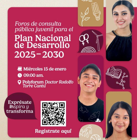 “¡Juventudes de Tamaulipas les tenemos una gran invitación, ya está abierta la convocatoria para los Foros de consulta pública para el Plan Nacional de Desarrollo 2025-2030!. Ya puedes registrarte y ser uno de los jóvenes que participe este próximo 15 de enero”.