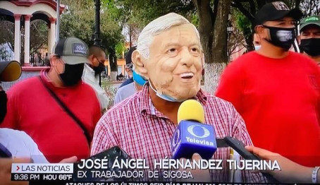 Es decir que, el ex trabajador de “Siderúrgica del Golfo, S. A.”, SIGOSA, JOSÉ ANGEL HERNÁNDEZ TIJERINA, decidió utilizar una máscara de “El Peje”, durante la manifestación de Protesta llevada a cabo este lunes, en reclamo de prestaciones laborales que nadie les ha resuelto.
